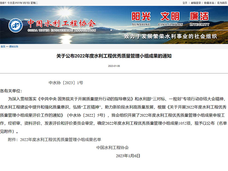 近日中国水利工程协会同时发布了《关于公布2022年度水利工程优秀质量管理小组成果的通知》、《关于公布2022年度水利行业...