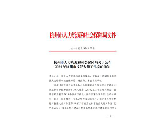 近日,杭州市人力资源和社会保障局公布了2024年度杭州市技能大师工作室名单。经单位申报、区县(市)推荐、专家评审及公示等...