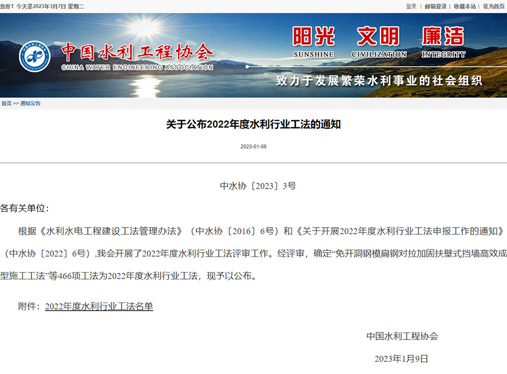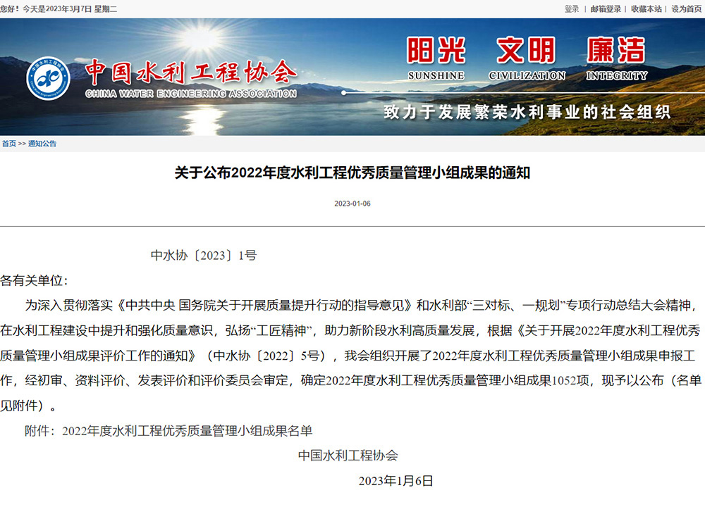 近日中国水利工程协会同时发布了《关于公布2022年度水利工程优秀质量管理小组成果的通知》、《关于公布2022年度水利行业工法的通知》,公司申报的相关QC成果及工法全部评审通过。