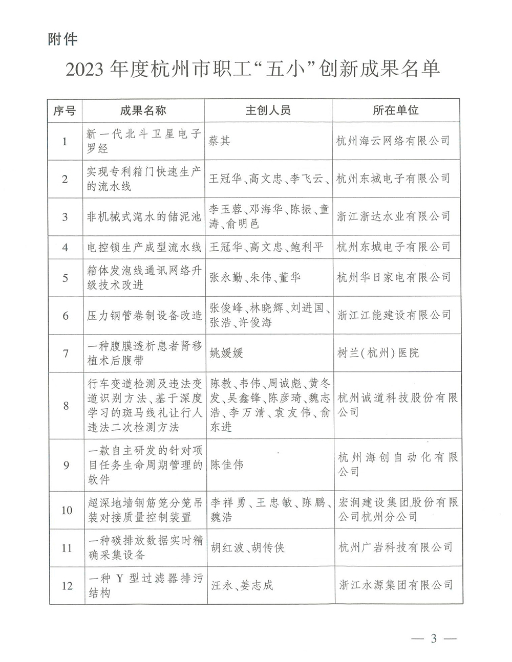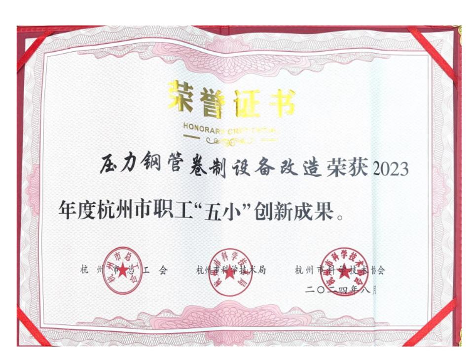 近日,又一个好消息传来,公司申报的“压力钢管卷制设备改造”荣获2023年度杭州市职工“五小”创新成果。